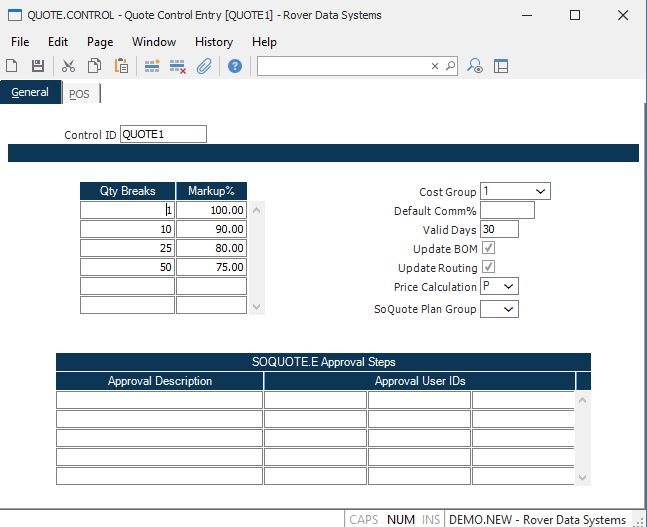 Qty Breaks Enter the quantity breaks which will default into the quote procedures. Once defaulted, they may be modified on the quote as required.
