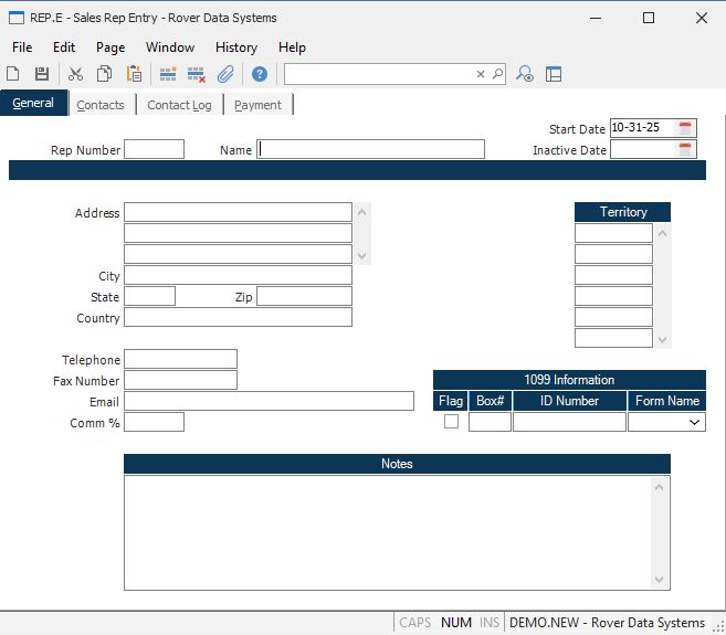 Start Date Enter the date this rep started working for your company. On new records, the current date will be loaded into this field for you but can be changed as required.