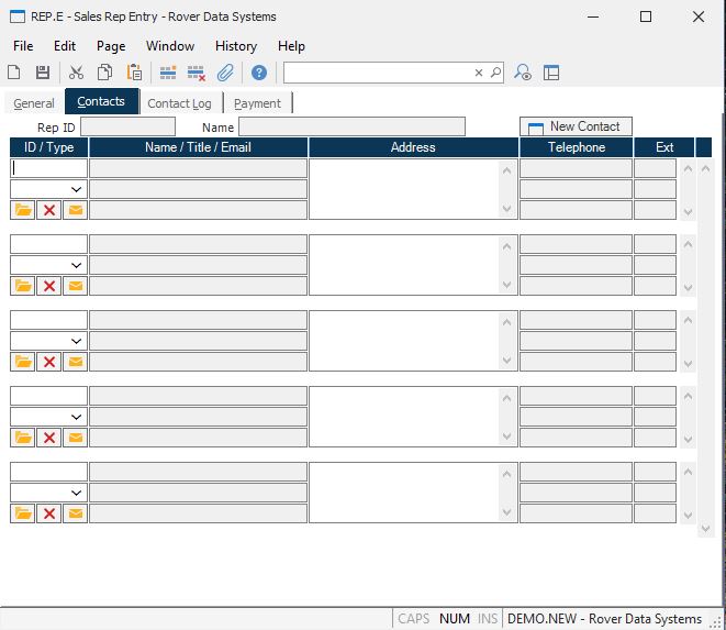 Contact ID Displays the IDs of all the contacts associated with the rep. To add an existing contact to the list you may enter the contact ID or a word or portion of a word from the contact name to display a list of possible entries to select from. If the contact is not already on file you may create it by clicking the "New Contact" button.