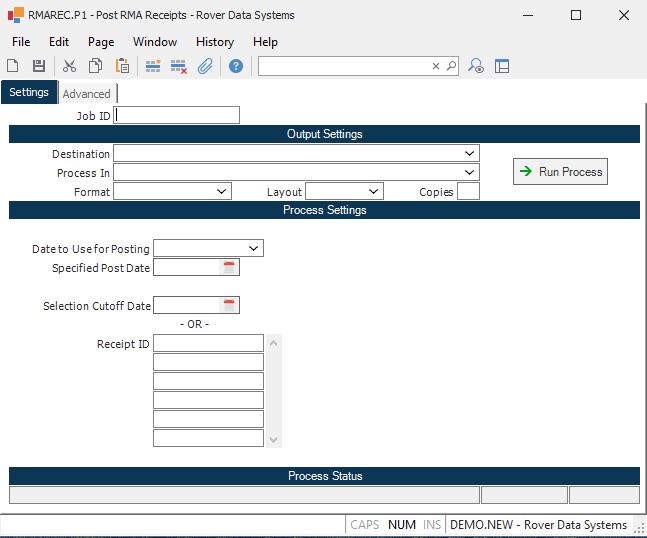 Receipt ID If you want to post only specific RMA receipts, enter the receipt numbers in this field. If you leave this field blank then all confirmed receipts will be posted based on the cut-off date.