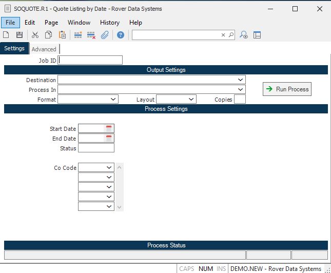 Run Process Click on the button to run the process. This performs the save function which may also be activated by clicking the save button in the tool bar or pressing the F9 key or Ctrl+S.