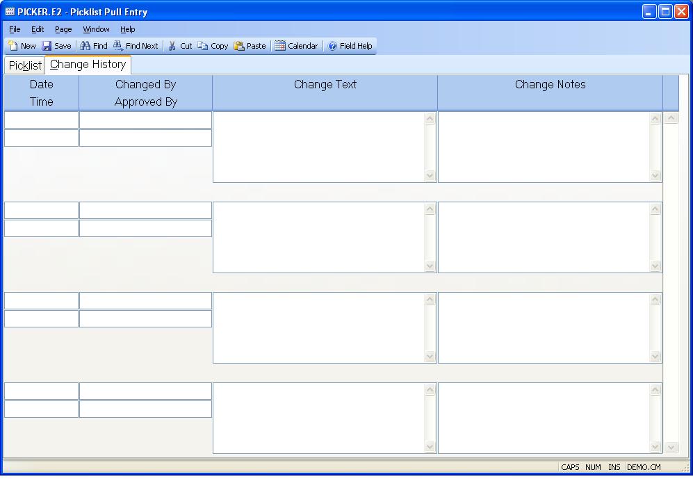 Change Date The date the PICKER record was changed. This is only stored if one of two conditions are met: 1) The parameters are set in CHANGE.CONTROL and a change was made that met the criteria for storing change history or 2) Change notes were entered by the user. This field is system controlled.