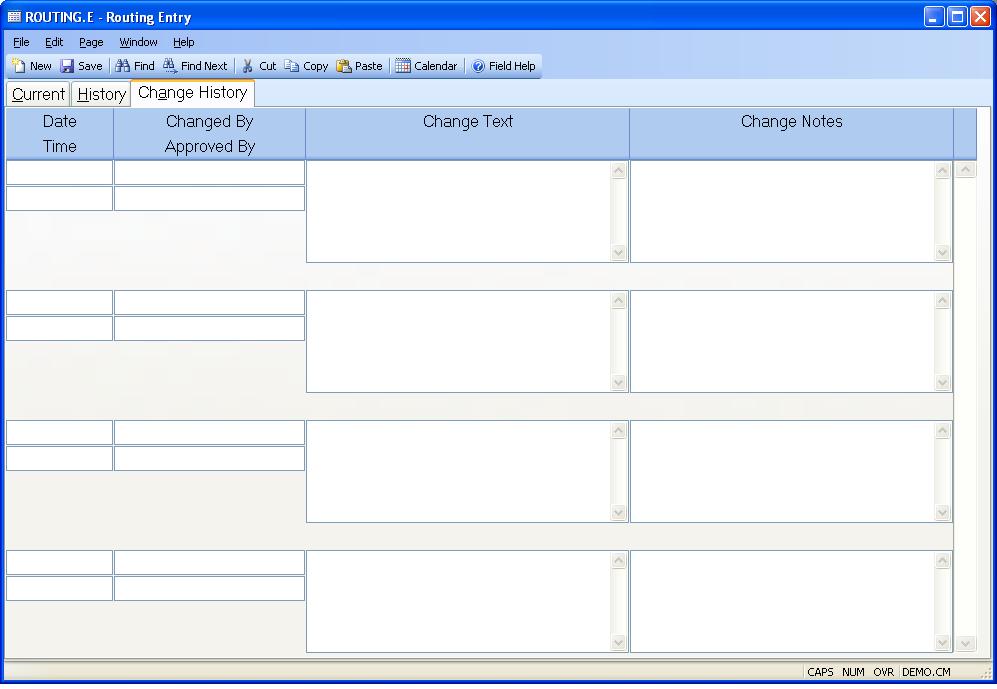 Change Date The date the ROUTING record was changed. This is only stored if one of two conditions are met: 1) The parameters are set in CHANGE.CONTROL and a change was made that met the criteria for storing change history or 2) Change notes were entered by the user. This field is system controlled.