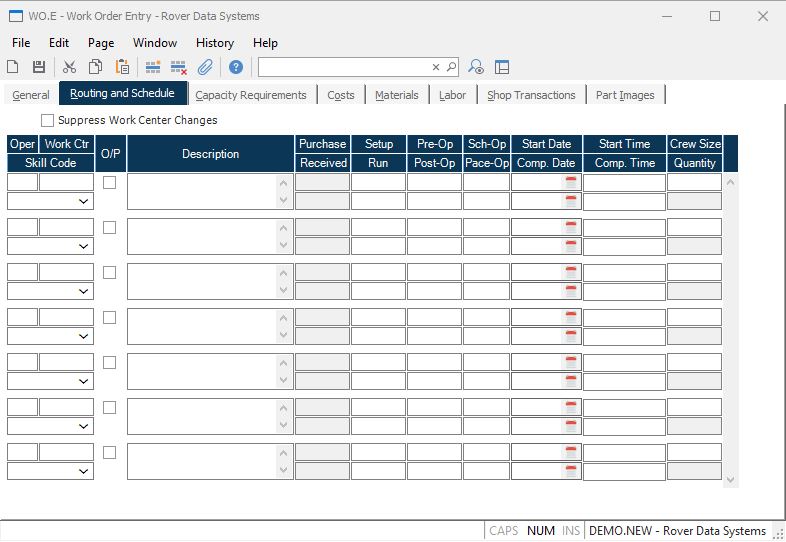 Work Center Contains the work center loaded from the routing file for the operation. Work centers may be changed as required. If a new operation has been added then the setup, preoperation and postoperation hours will be loaded from the Work Center file.