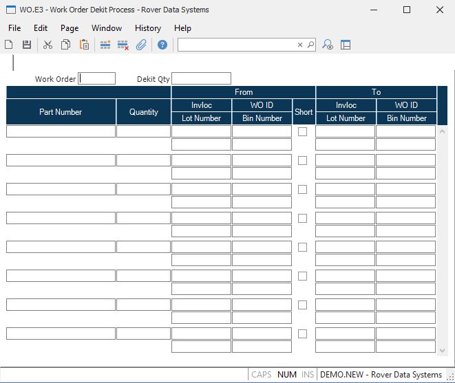 Dekit Quantity Enter the quantity that represents the WO quantity being dekitted. This prompt will default to the current WO quantity. Changing the quantity will have the effect of changing all of the part quantities on the lower portion of the screen.