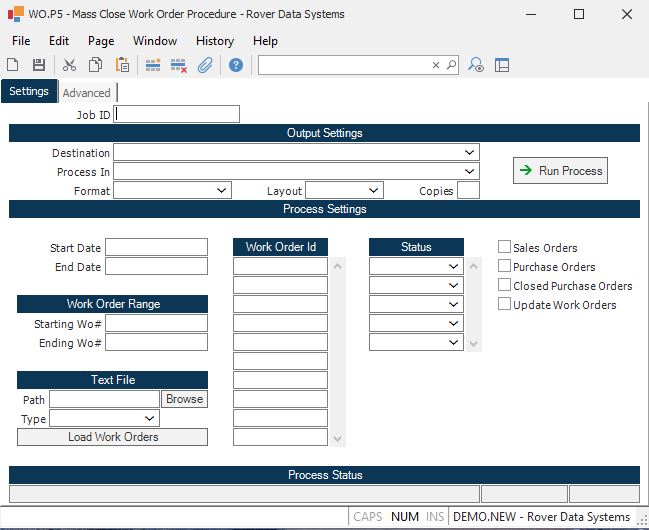 Status If you wish to limit this process to work orders with a specific status, enter the status in this field.