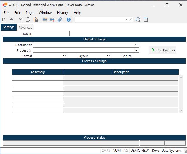 Assembly Enter the assembly number for which you wish to re-load the data into the Picker and Woinv records. Leave this field empty to load all work orders with a status of "R".