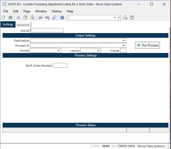 Work Order Number Enter the number of the work order whose outside processing adjustment records are to be listed.