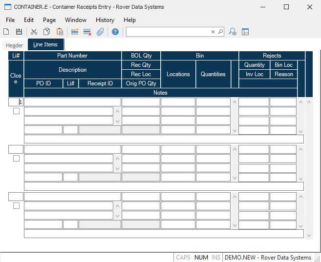 Li# Enter the line item number to be used in identifying the associated item on the container. The next sequential number will be automatically assigned if the prior line item is numeric.
