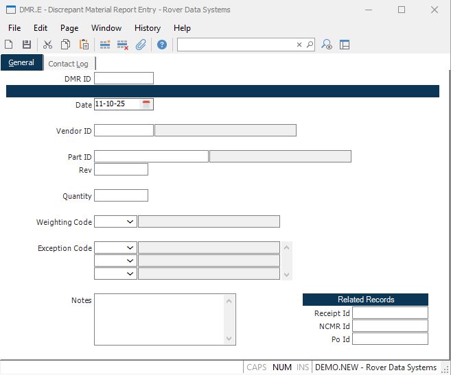 Receipt Id If applicable, enter the purchase order receipt that this DMR record was created for. There is an option in RECEIPTS.E2 to create the DMR records for the material being returned to the vendor.