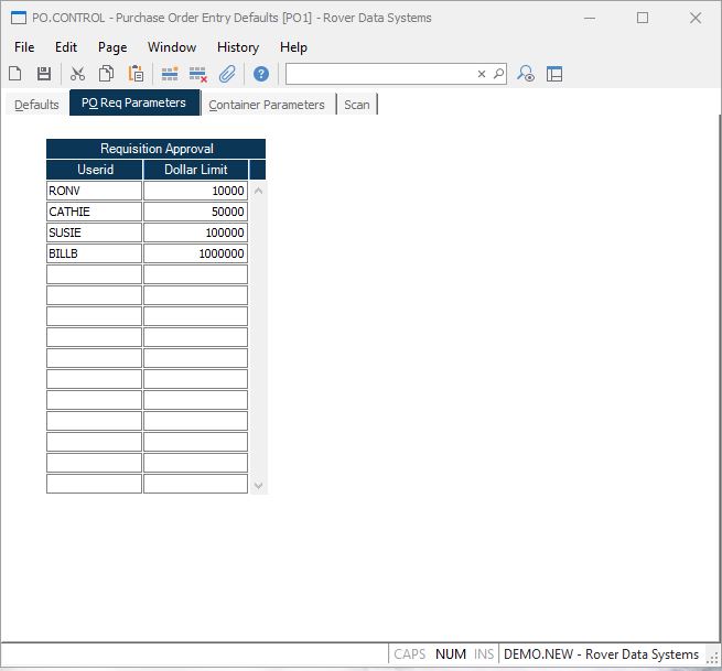 Userid Enter the userids that are authorized to approve purchase requisitions for the associated dollar amount. If no userids are entered then no check will be made when the purchase requisition is approved.