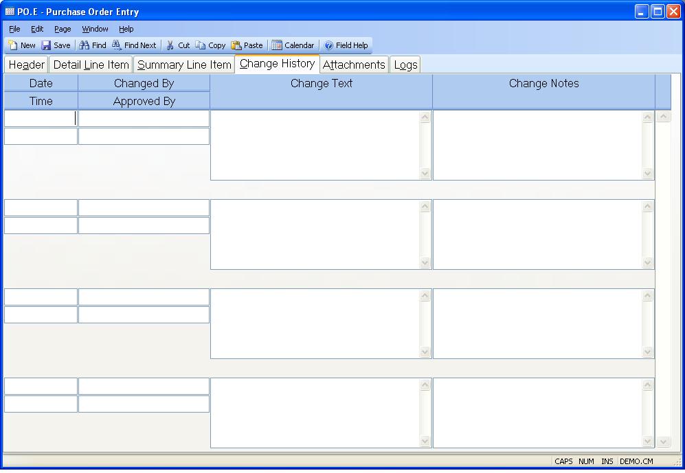 Change Date The date the purchase order was changed. This is only stored if one of two conditions are met: 1) The parameters are set in CHANGE.CONTROL and a change was made that met the criteria for storing change history or 2) Change notes were entered by the user. This field is system controlled.