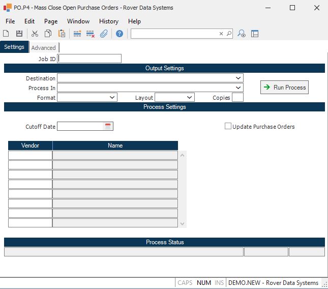 Cutoff Date Enter the cutoff date to be used in this procedure. All open purchase orders with an order date less than or equal to the cutoff date will be included. This is a required field.