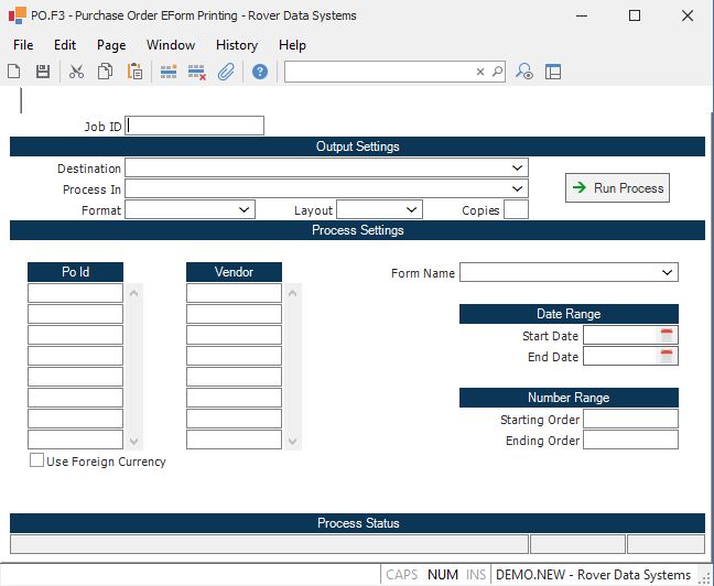 Purchase Order Number Enter the list of specific purchase orders you to have printed. To print ranges by date or order number, leave this field empty. To print all orders which have not yet been printed, leave all fields on this screen empty.