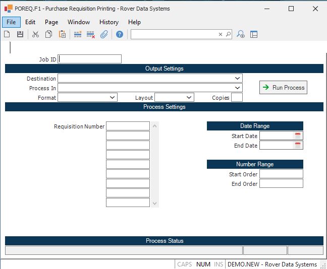 Start Date Enter the start of the date range for which you wish to print requisitions. This date is used to select orders which were printed on a selected date (not necessarily the requisition date).