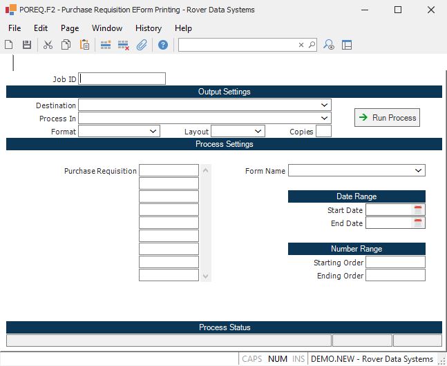 Purchase Order Number Enter the list of specific purchase requisitions you to have printed. To print ranges by date or order number, leave this field empty. To print all requisitions which have not yet been printed, leave all fields on this screen empty.