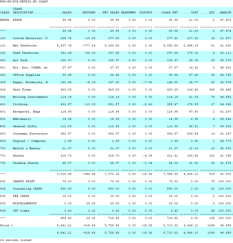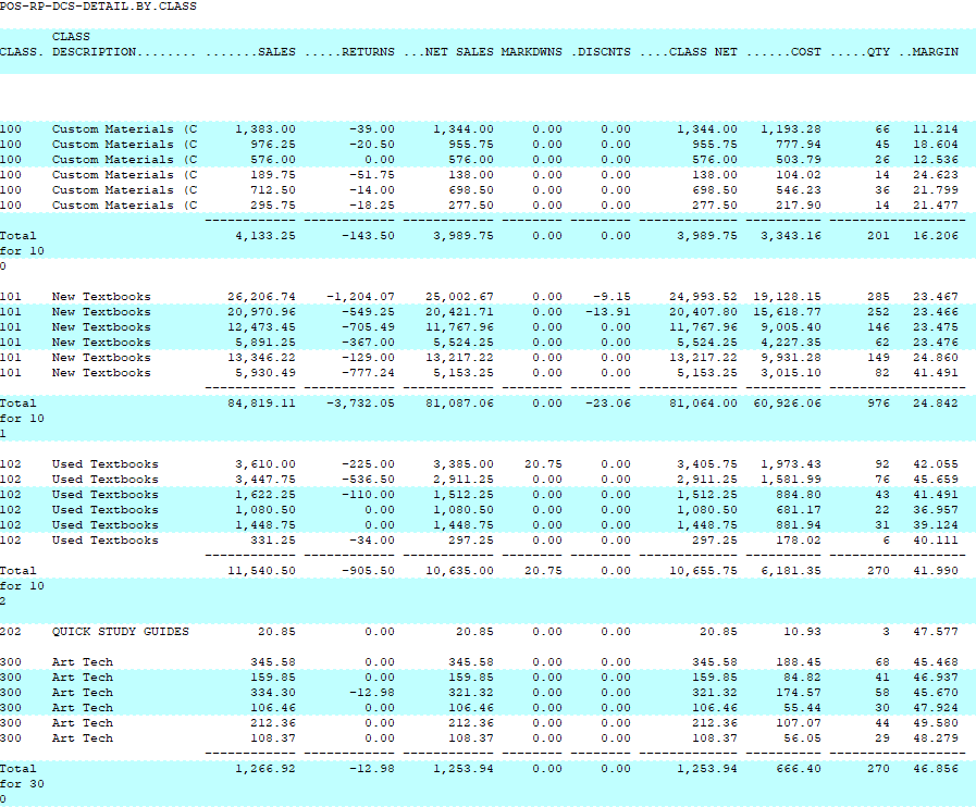 Output: Class, Class Description, Sales, Returns, Net Sales, Markdowns, Discounts, Class Net, Cost, Quantity and Margin.