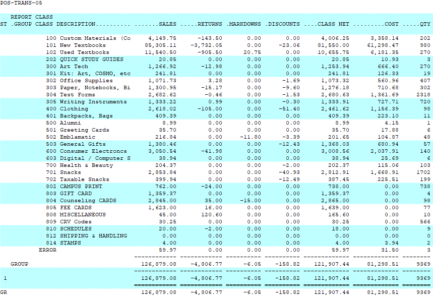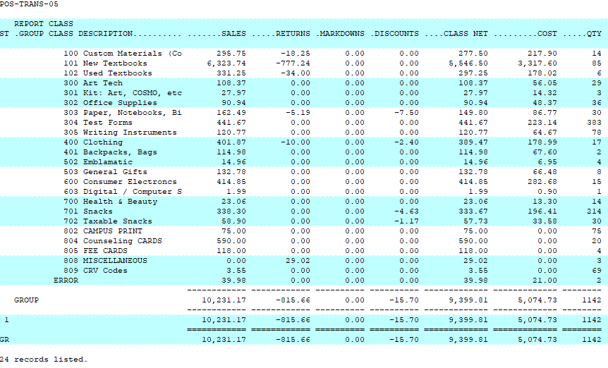 Creating a class Report Category is found in POS-22-3-5. Once a category has been created you can assign it to the classes belonging to that report category in POS-22-3-2.